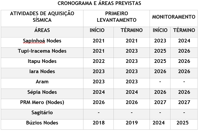 Os levantamentos das fases monitoras do Cluster BS ocorreram com as Atividades de: Pesquisa Sísmica Marítima 4D Nodes no Campo de Sapinhoá – Fase Monitora, entre agosto de 2023 e janeiro de 2024, Pesquisa Sísmica Marítima 4D Nodes no Campo de Búzios, entre setembro de 2024 e abril de 2025. E, as atividades de Pesquisa Sísmica Marítima 3D Nodes nos Campos de Tupi e Iracema iniciou em abril de 2025, Atividade de Pesquisa Sísmica Marítima 4D Nodes no Campo de Itapu iniciou em dezembro de 2025 e Atividade de Pesquisa Sísmica Marítima 4D Nodes nos Campos de Sépia e Iara que iniciou em fevereiro de 2026, em andamento.
