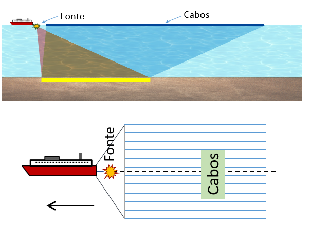 Figura 1 – Representação esquemática da sísmica de cabos flutuantes (streamers)