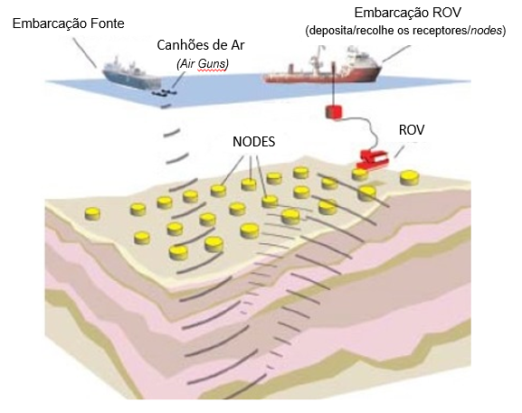 Figura 2 - Representação esquemática da sísmica Nodes de Fundo Oceânico - Ocean Bottom Nodes – OBN.
