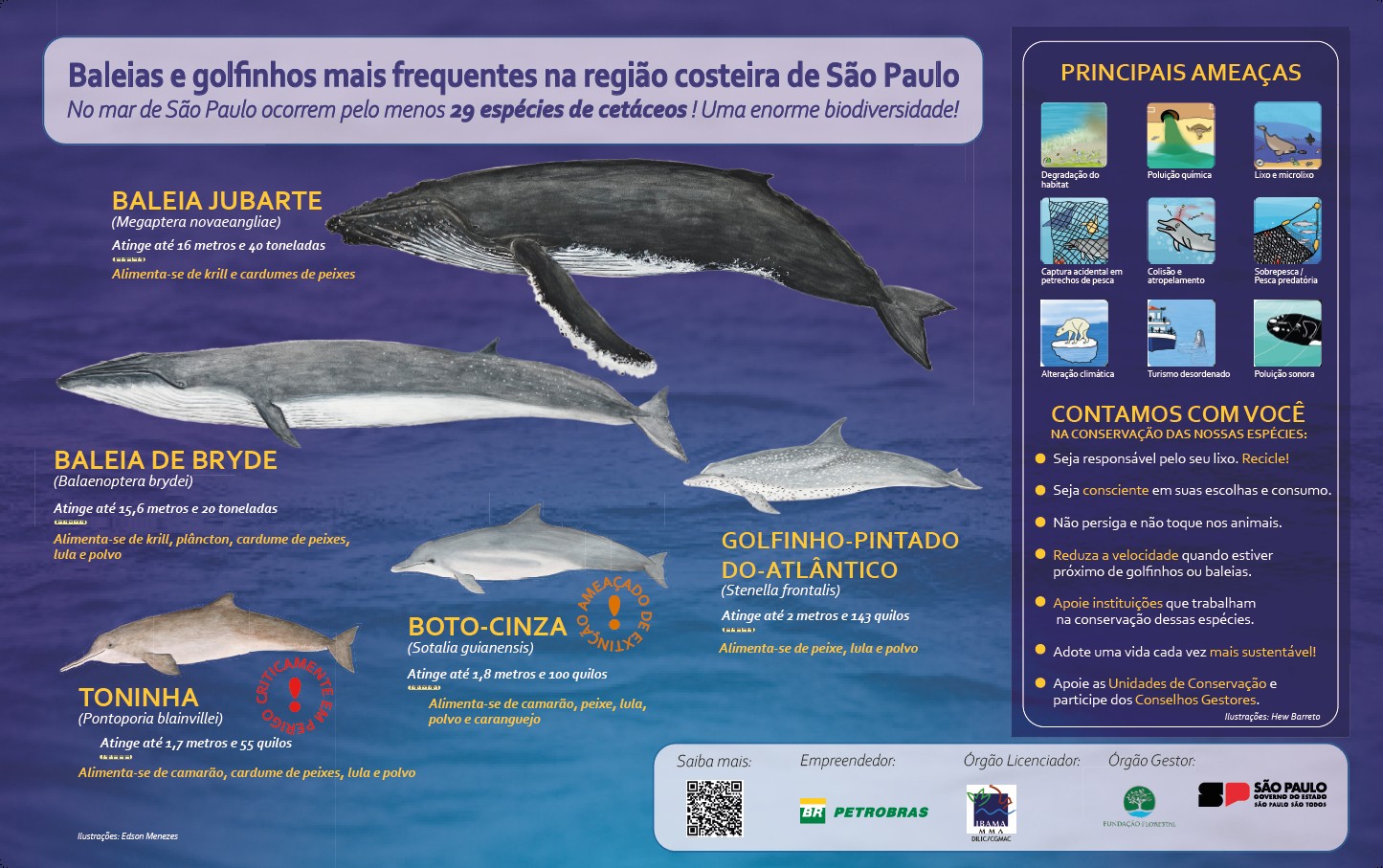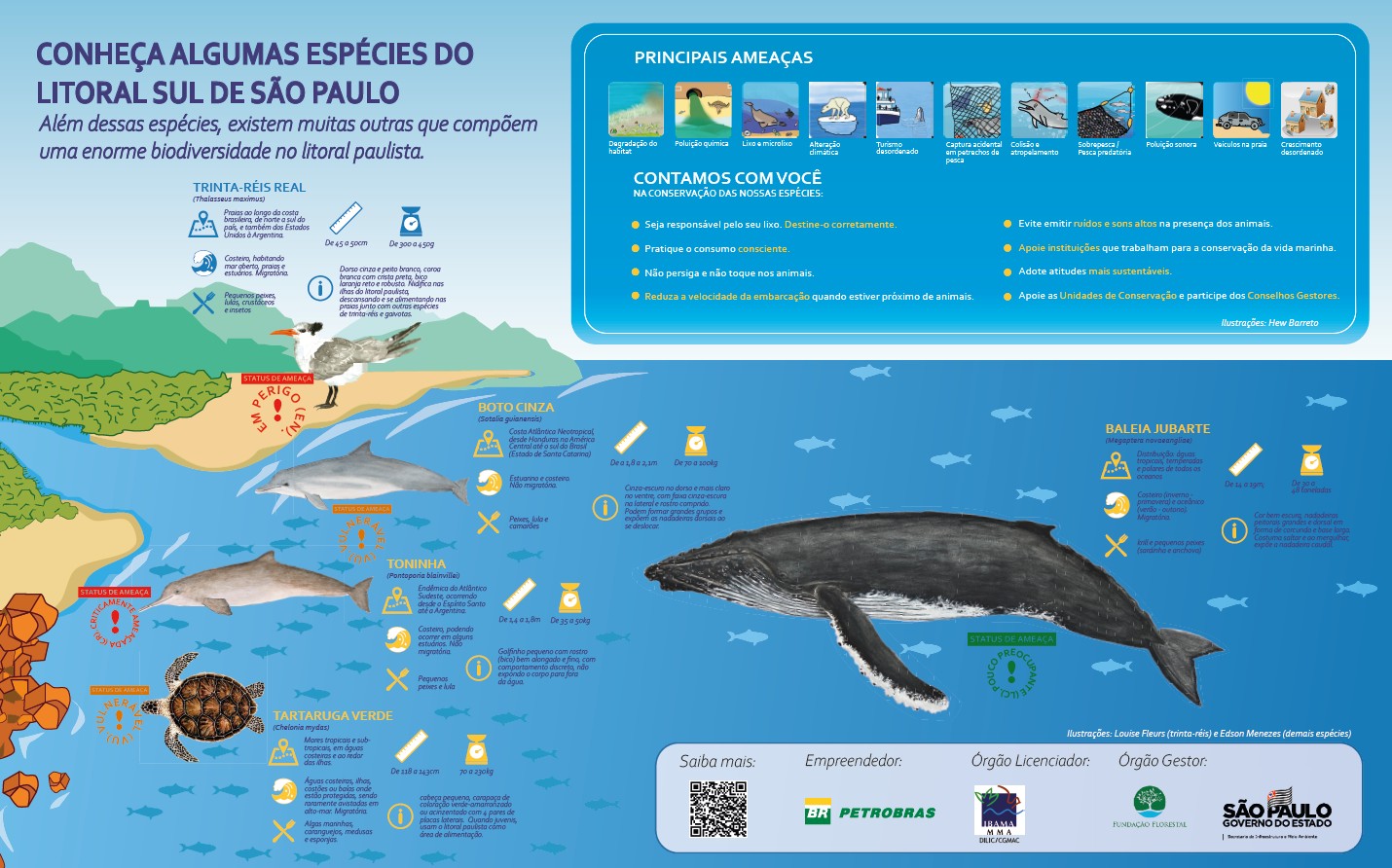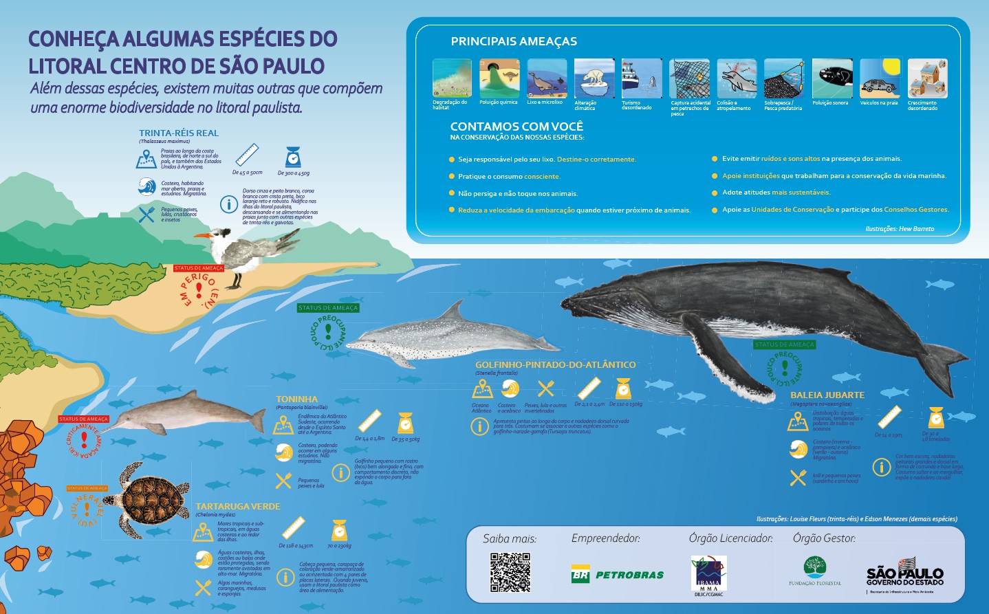 Ambos os materiais priorizam a identificação dos principais vertebrados marinhos do litoral de São Paulo, seus hábitos, ameaças e principalmente ações para preservação.
